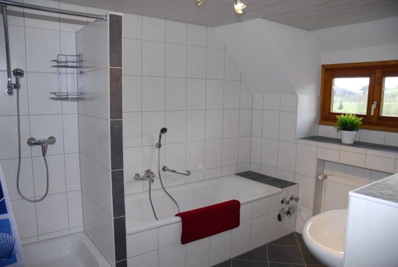 Badezimmer mit Fenster, Föhn, WC und Dusche und Badewanne